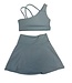 Asymmetrical one shoulder crop with removeable padding in sizes 12 & 14. Comes in Black, Bubblegum, and Icicle Blue!